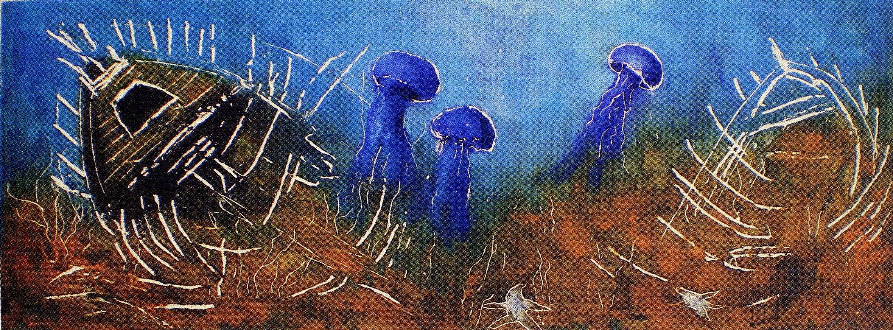 É un naufraxio; pero non a perda que poderiamos pensar dun naufraxio. Este é un naufraxio presenza, un naufraxio xurdimento, un naufraxio vida. Antonio pinta un pecio en negativo, en reserva de branco ou ausencia de tinta que, no cadro, viría a ser a carne, a materia das cousas. Así, máis que un tema no papel, danos toda a historia, a desa permanencia, a do que foi, do que segue e do que seguirá sendo. E é tamén o barco espectro, o tema do barco aparecido, que aquí, entre nosoutros, temos mesmo por un ser, por un suxeito vivo, habitante dese tempo outro e acompañante. É o barco maxicoliterario, errante polos recunchos da lenda e da fantasía, que Antonio preserva para a súa fábula coa forma dunha dorna, un receptáculo, un oco que, en vez de aludir ao baleiro ou á perda, se nos antolla un berce, un ventre, un seo de vida. É o círculo da renovación, a continuidade metafórica que Antonio pensou, intuíu, no seu pecio-vida; o azul abisal e elegante das medusas que acompañan esa espectralidade coa súa danza, o seu ondear sensual, como de saba, coa carga onírica ou tanática, tamén espectral, que ten a saba. Viunas, Antonio, xurdindo de entre as cadernas da dorna, levando ou traendo a luz acuosa da alma da dorna no outro azul, o da fondura.
